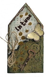 For the bottom of the house I applied old gold Ferro texture paste and stamped into it with a PaperArtsy stamp. Once dry I swiped olive metallic paint over it. Then I added the key. I glued on the music paper using matte medium and this gave me the idea for the play on words; in tune... in key.... so, I wrote those phrases onto the piece and then added the embellishments. The large dots are acrylic paint with gel pen dots added on top.