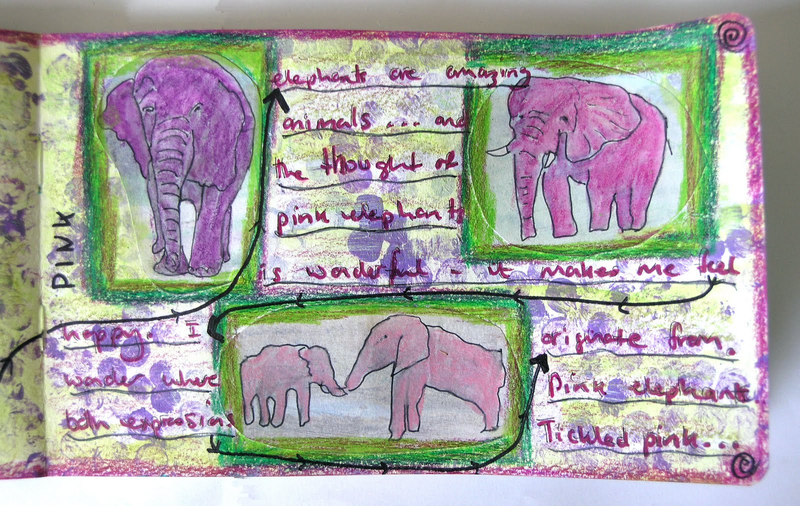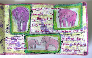 Well, we are now into the second quarter of Art Journal Caravan, and the theme this week is 'tickled pink'. First my drawn journal pages. I started with an acrylic background, pasted on images of elephants over which I applied gesso. Once dry I drew over the shapes and coloured them pink with water soluble oil pastels. I added further colour to the background and wrote my thoughts.
