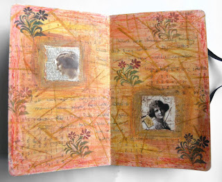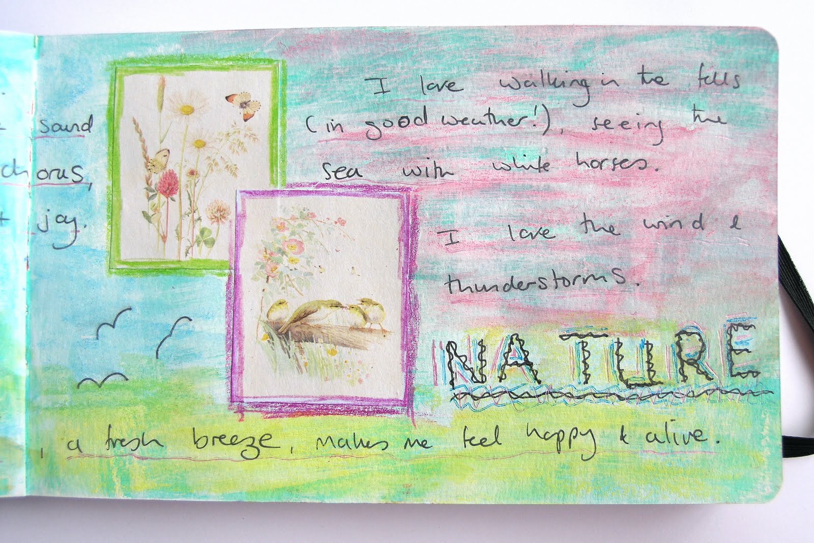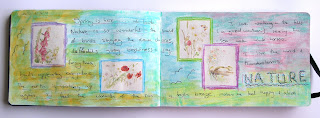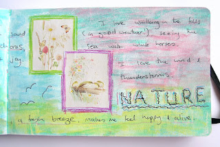 My mixed media pages have an initial layer of green acrylic paint over-painted with gesso. I added the pictures (a freebie from a craft magazine) and framed them with Coloursoft pencils. Having written my thoughts, I added further colour with water-soluble oil pastels - I only bought these a month or so ago and I LOVE them!