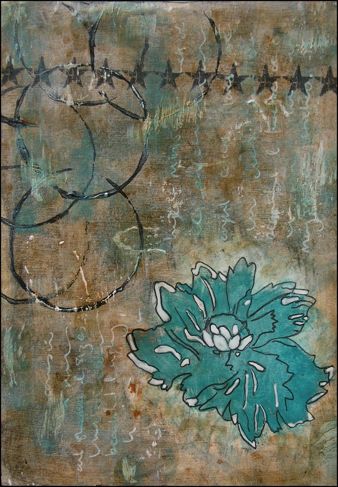 I pasted a piece of Anna Griffin paper onto a piece of cardboard. Onto this I painted a thin layer of white gesso and then patches of black gesso, leaving one of the flowers visible. I mixed some Distress Ink tea dye refill with some acrylic glazing medium and brushed it over the whole of the piece to give the brown colouring. Then came the stamping - Tim Holtz stars, and black circles using the inside of a toilet roll dipped in black acrylic paint. At this stage I used a toothbrush to add some white gesso brush marks. I outlined the flower with a black, waterproof pen and coloured it with transparent acrylic paint. Having written over the background with a white gel pen, I painted patches of the same colour over the background to promote some integration. A few more patches of tea dye colour, a few highlights with the gel pen and the black border finished the piece.