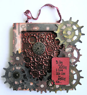 One of the things I bought was a TSS mould of cogs for metal work, so this is where I started. After laboriously moulding my metal I stuck it to some chipboard and added a border. I then built up a frame from foam board around it and covered it with Tim Holtz paper. I then die cut some cogs with my Cuttlebug machine using my new Tim Holtz die, sprayed them with various coordinating shades of Glimmer Mist, stuck them, once dry, onto acetate and cut around them so the acetate doesn't show. I stuck this to the frame and then added some metal sprockets. I added the PaperArtsy stamp ( I'm not not sure I understand it, but it fitted!) and clock face as points of focus. Done!