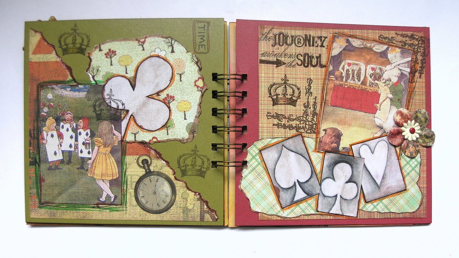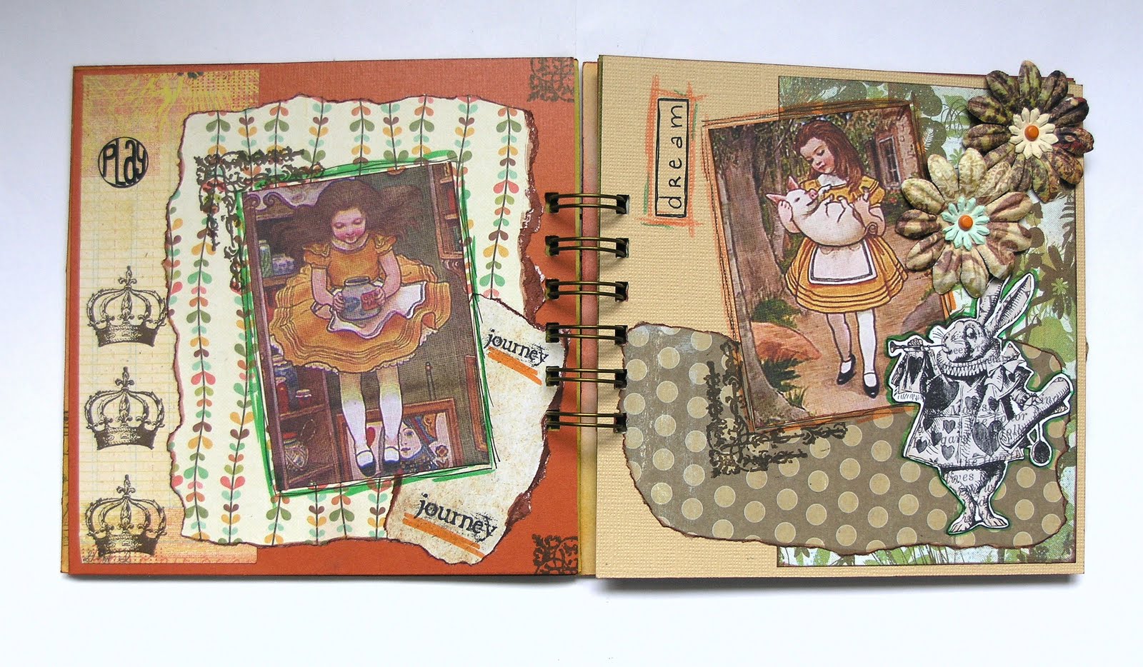 I stamped both sets of tickets using Tim Holtz stamps and coloured the words of the smaller ones. I made the flower by die-cutting two flowers of the same size, cutting out a petal of the beige one and gluing the remaining part of the flower back together, and then layering them together and securing with a brad.