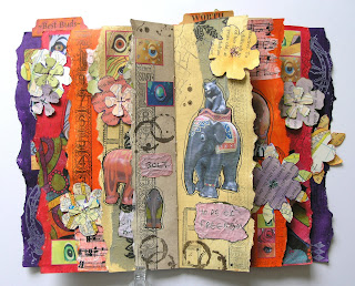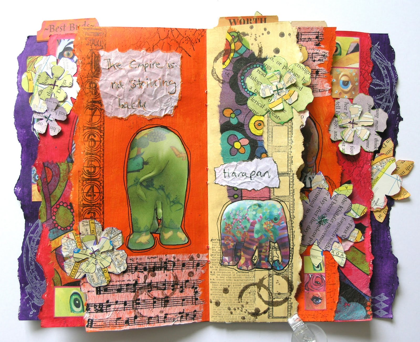 I tore the paper to size and the painted the pages in varying colours of acrylic paint. I decorated them with paper serviettes, various stamps, pictures of the elephants (including some details), some paper flowers and decorative tabs. I outlined the elephants with various pens and wrote the name of each elephant on a piece of paper that I then stuck on the relevant page. I joined the pages by making holes in the centre of the pages and threading them with wool.