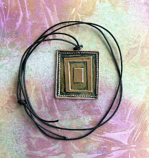 This piece started out as a clear plastic fragment, measuring approximately 3.5 x 4.5 cm. I decorated some black paper with Glimmer Mists. Once dry I drew around the fragment and cut out it out. I used Glossy Accents to attach it to the fragment - it's clear so it doesn't show. To decorate the front I used some Tim Holtz Foliage pieces coloured with alcohol inks, and in the lower left-hand corner a 7gypsies rub-on. The last step was adding the ribbon.