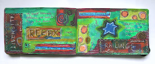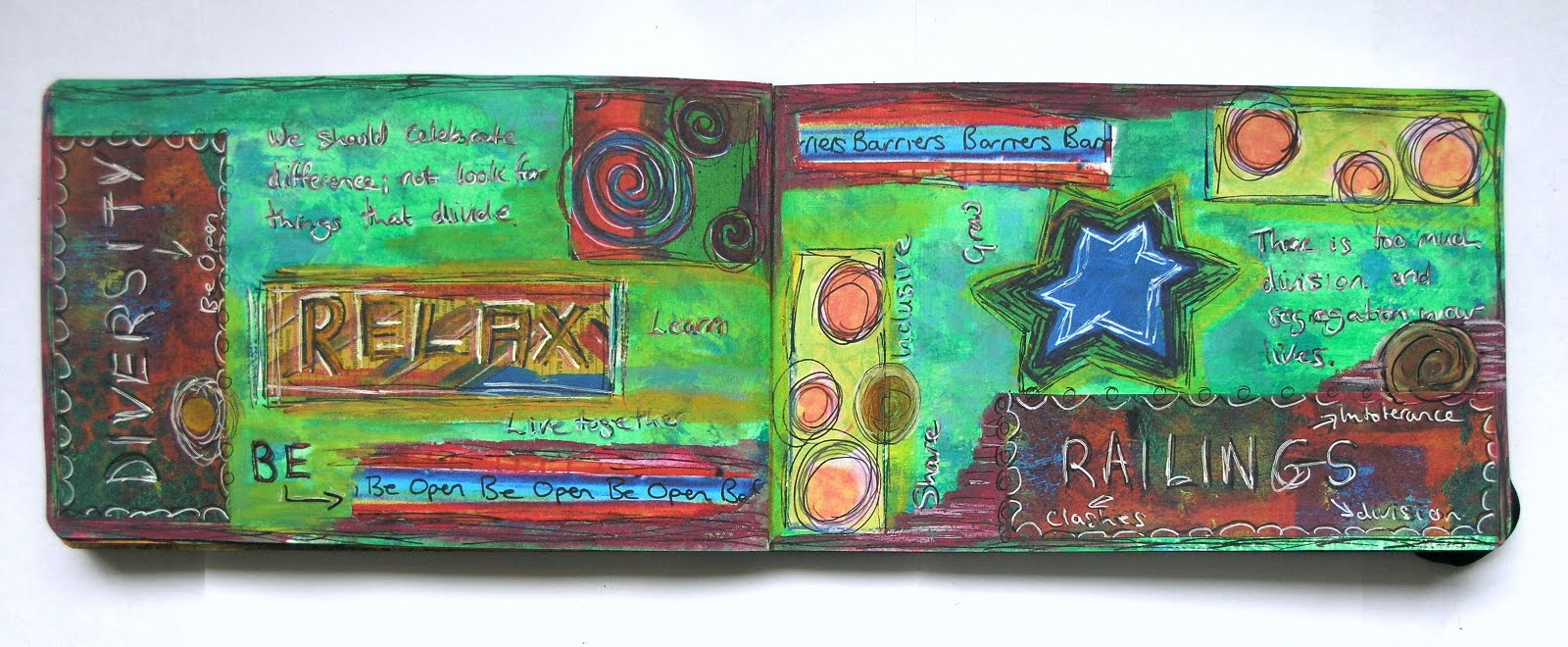One of the prompts from Art Journal Caravan this week was to look out of the window and think about the first thing you see with blue in it. For me, this was the blue railings of our 'balcony'. This led me to think about division and diversity and here are the pages that arose from those thoughts.