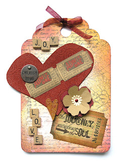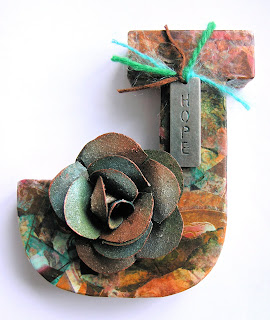 For a while now I have had a cardboard 'J' stashed away, so I thought it was about time I did something with it. I covered it with little pieces of patterned tissue paper using matte medium. Once dry I added some sprays of Glimmer Mist and added a rose that I made ages ago, which was also just sitting in my stash. As a final touch I added the metal tag and ribbons! The photo doesn't quite do it justice, but it's fairly close.