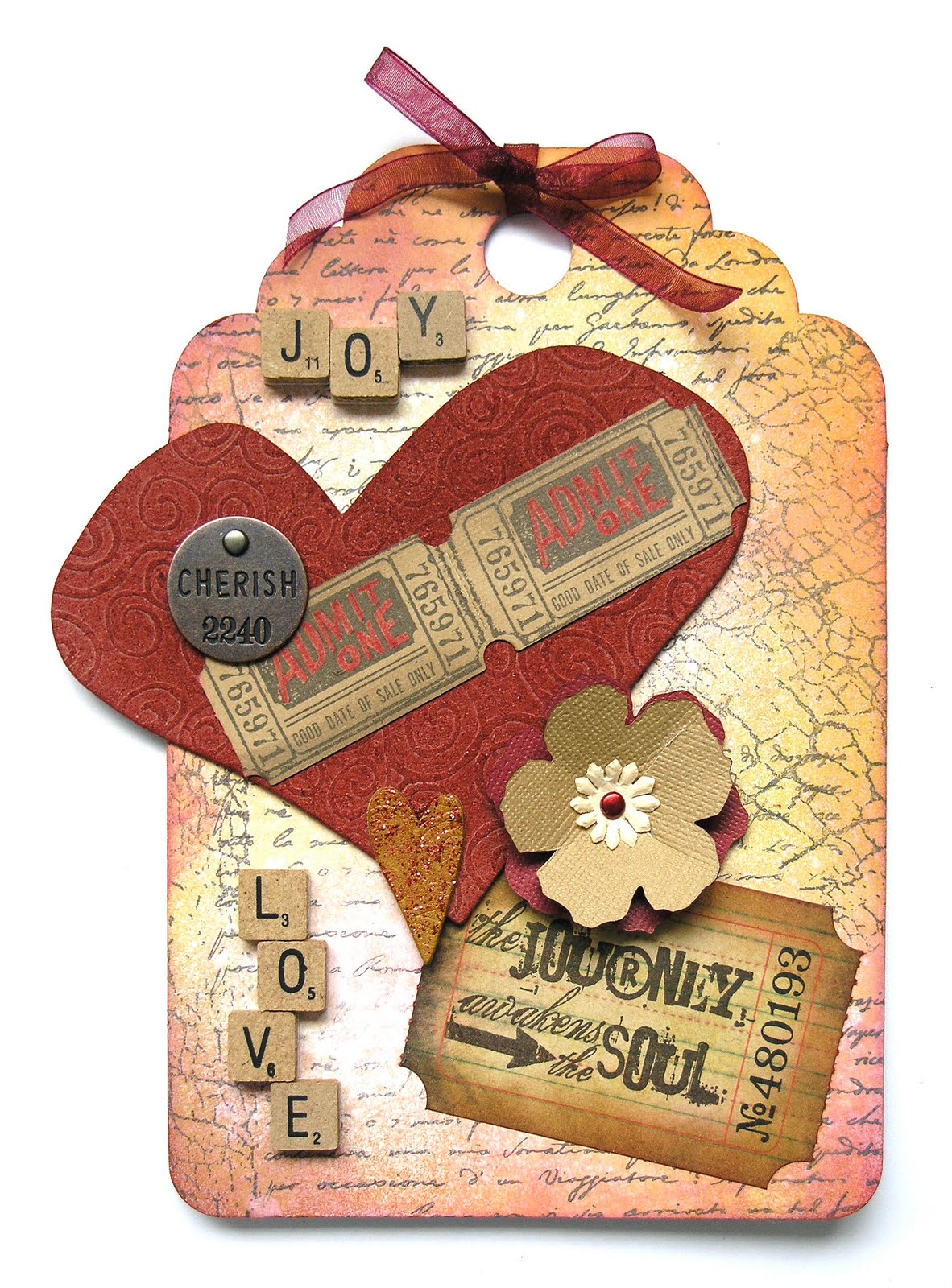 The large heart is pre-cut Grungeboard that I coloured with red brick distress in. I coloured the little heart with scattered straw Distress Ink and added some glitter.